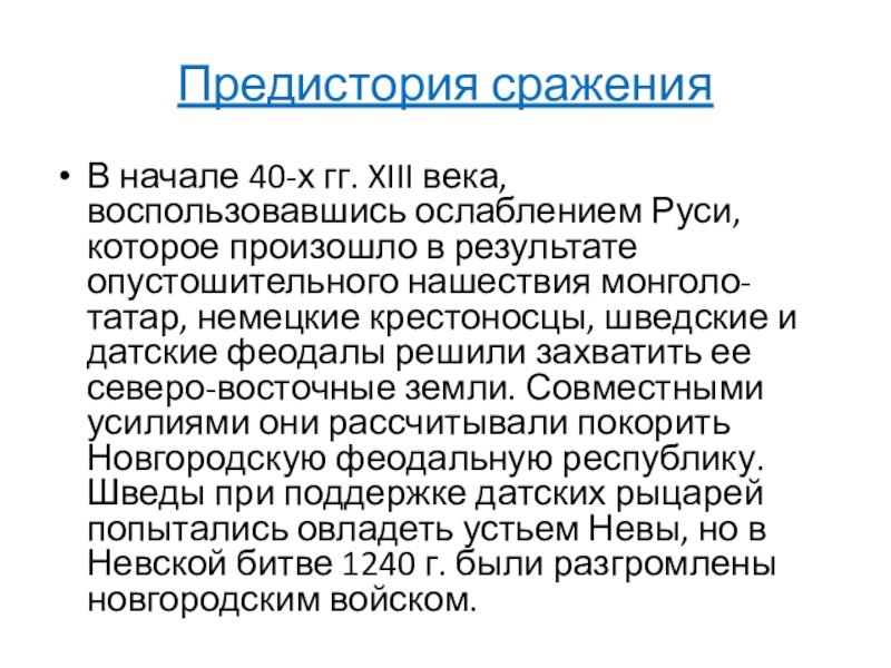 произошло в результате опустошительного нашествия монголо-татар, немецкие крестоносцы, шведские и датские феодалы решили захватить ее северо-восточные земли. Совместными усилиями они рассчитывали покорить Новгородскую феодальную республику. Шведы при поддержке датских рыцарей попытались овладеть устьем Невы, но в Невской битве 1240 г. были разгромлены новгородским войском.