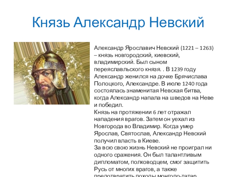 киевский, владимирский. Был сыном переяславльского князя. . В 1239 году Александр женился на дочке Брячислава Полоцкого, Александре. В июле 1240 года состоялась знаменитая Невская битва, когда Александр напала на шведов на Неве и победил.