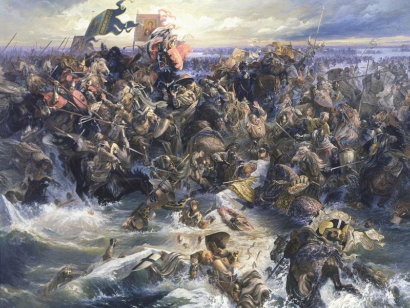 Рыцарский клин прорвал центр русского войска. Наткнувшись на обрывистый берег