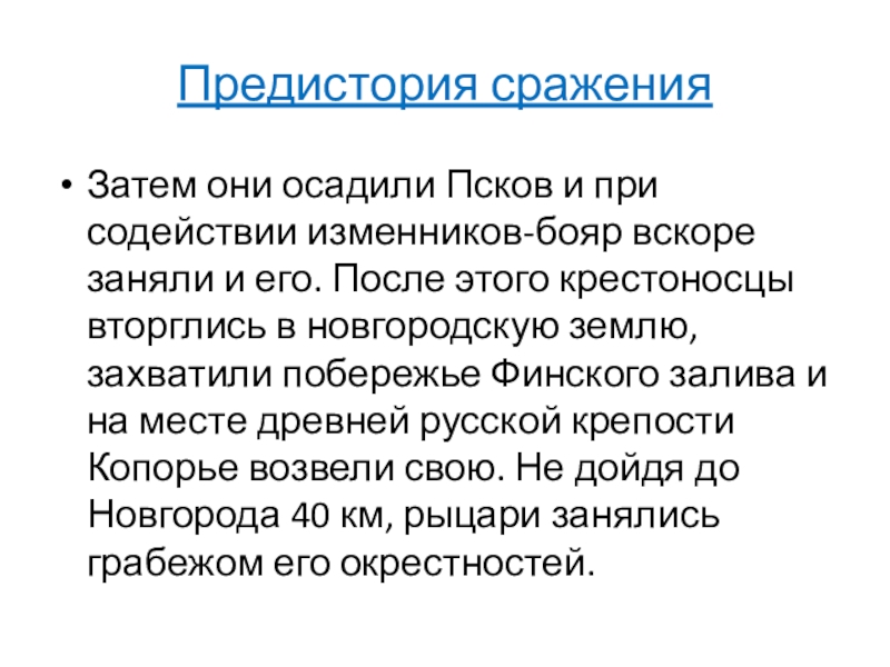 и его. После этого крестоносцы вторглись в новгородскую землю, захватили побережье Финского залива и на месте древней русской крепости Копорье возвели свою. Не дойдя до Новгорода 40 км, рыцари занялись грабежом его окрестностей.