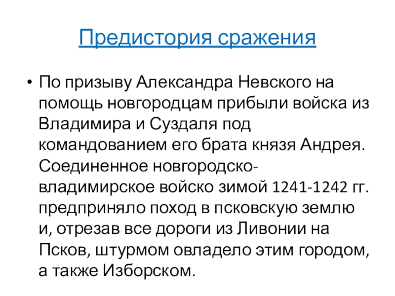 Владимира и Суздаля под командованием его брата князя Андрея. Соединенное новгородско-владимирское войско зимой 1241-1242 гг. предприняло поход в псковскую землю и, отрезав все дороги из Ливонии на Псков, штурмом овладело этим городом, а также Изборском.