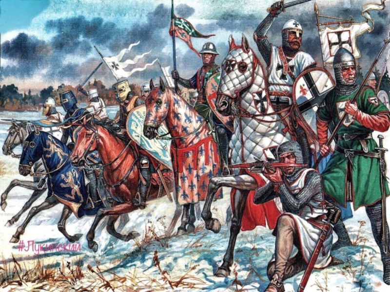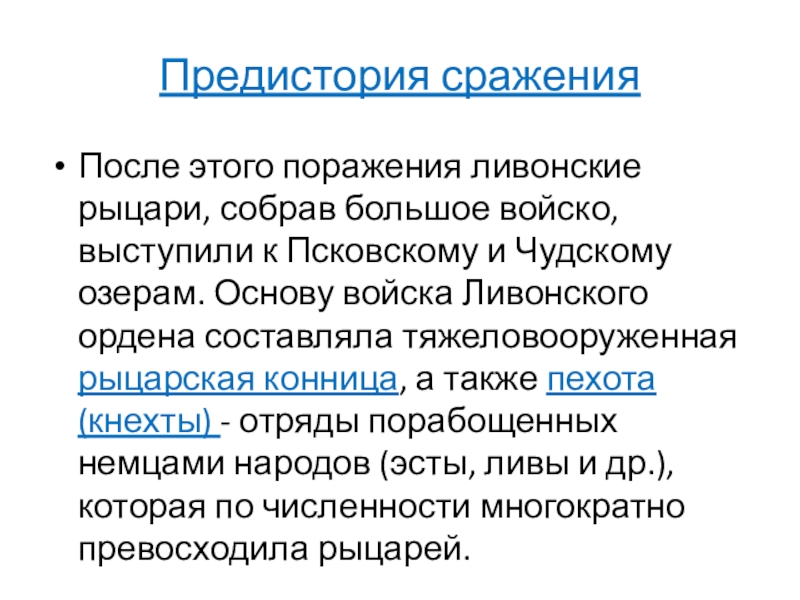 Псковскому и Чудскому озерам. Основу войска Ливонского ордена составляла тяжеловооруженная рыцарская конница, а также пехота (кнехты) - отряды порабощенных немцами народов (эсты, ливы и др.), которая по численности многократно превосходила рыцарей.