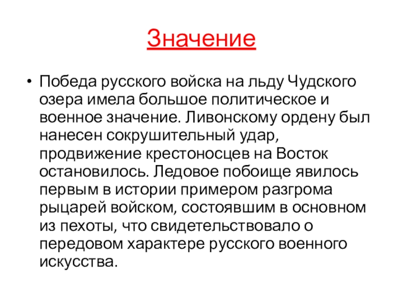 и военное значение. Ливонскому ордену был нанесен сокрушительный удар, продвижение крестоносцев на Восток остановилось. Ледовое побоище явилось первым в истории примером разгрома рыцарей войском, состоявшим в основном из пехоты, что свидетельствовало о передовом характере русского военного искусства.