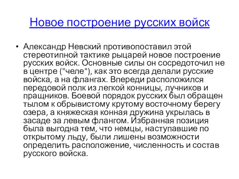 русских войск. Основные силы он сосредоточил не в центре ("челе"), как это всегда делали русские войска, а на флангах. Впереди расположился передовой полк из легкой конницы, лучников и пращников. Боевой порядок русских был обращен тылом к обрывистому крутому восточному берегу озера, а княжеская конная дружина укрылась в засаде за левым флангом. Избранная позиция была выгодна тем, что немцы, наступавшие по открытому льду, были лишены возможности определить расположение, численность и состав русского войска.