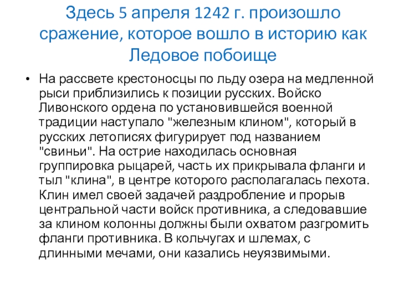Слайд 22Здесь 5 апреля 1242 г. произошло сражение, которое вошло в историю