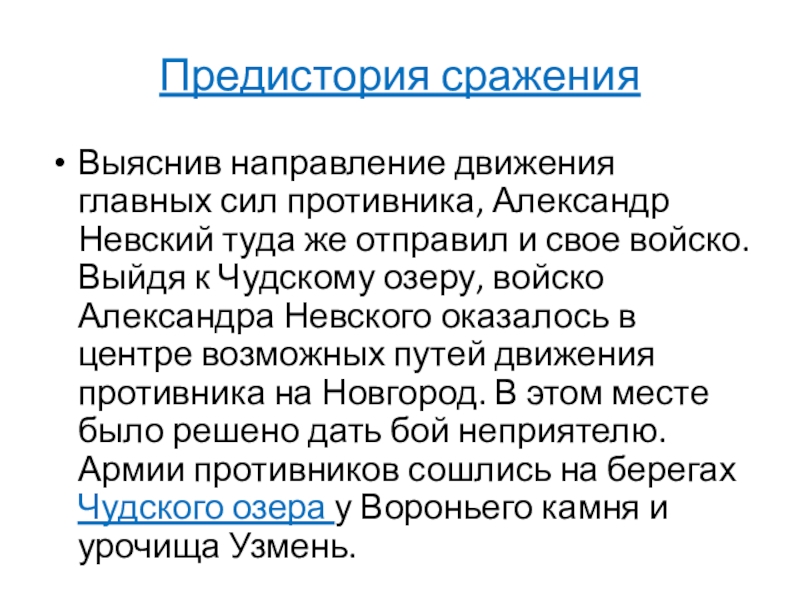 отправил и свое войско. Выйдя к Чудскому озеру, войско Александра Невского оказалось в центре возможных путей движения противника на Новгород. В этом месте было решено дать бой неприятелю. Армии противников сошлись на берегах Чудского озера у Вороньего камня и урочища Узмень.