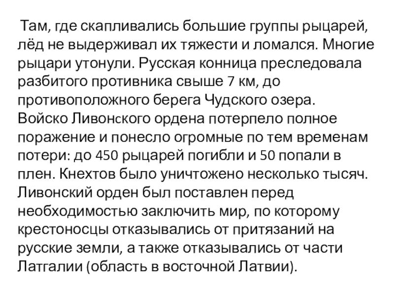 тяжести и ломался. Многие рыцари утонули. Русская конница преследовала разбитого противника свыше 7 км, до противоположного берега Чудского озера.