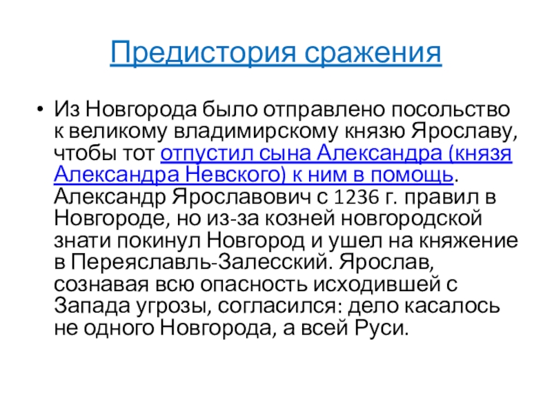 чтобы тот отпустил сына Александра (князя Александра Невского) к ним в помощь. Александр Ярославович с 1236 г. правил в Новгороде, но из-за козней новгородской знати покинул Новгород и ушел на княжение в Переяславль-Залесский. Ярослав, сознавая всю опасность исходившей с Запада угрозы, согласился: дело касалось не одного Новгорода, а всей Руси.