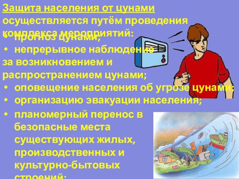 Защита населения от цунами осуществляется путём проведения комплекса мероприятий: