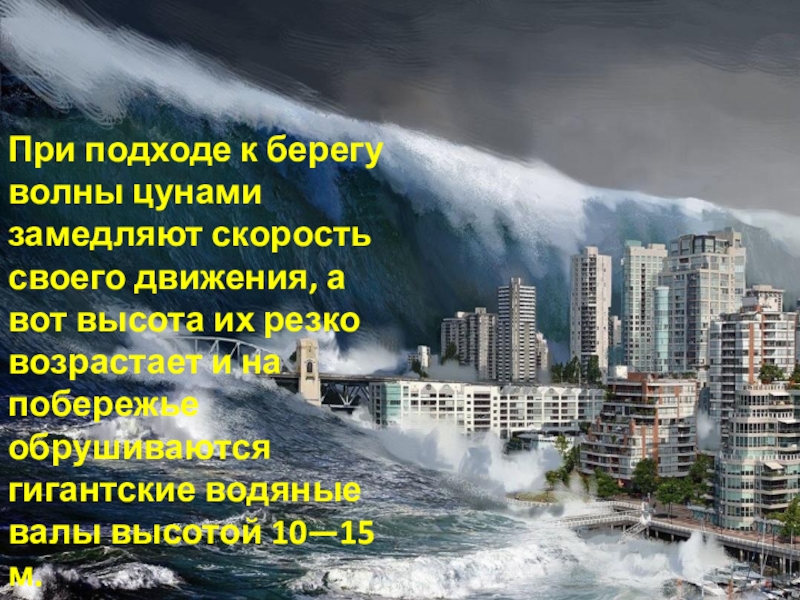 Слайд 13При подходе к берегу волны цунами замедляют скорость своего движения, а
