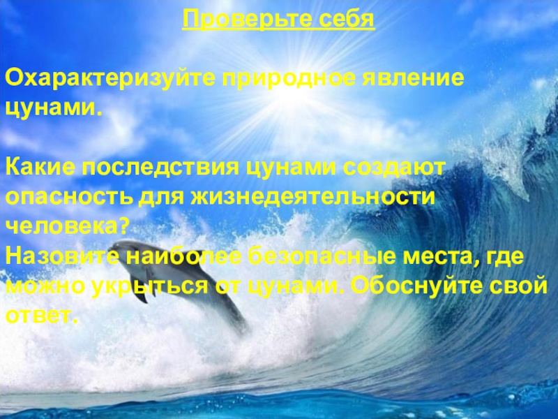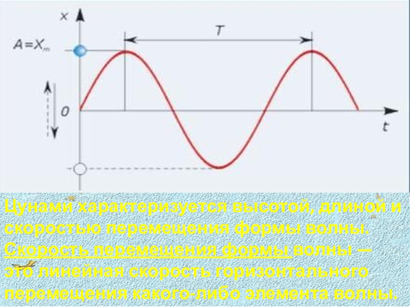 Слайд 9Цунами характеризуется высотой, длиной и скоростью перемещения формы волны.