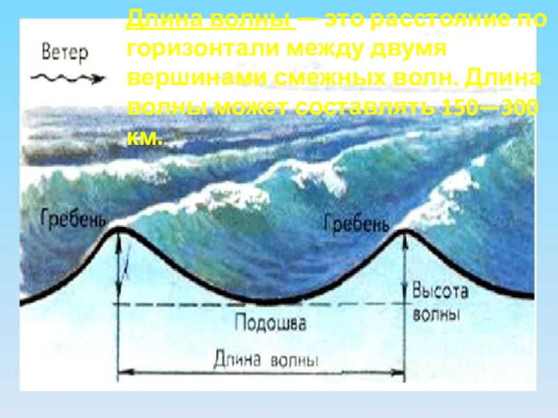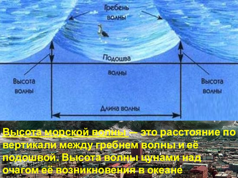 Слайд 10Высота морской волны — это расстояние по вертикали между гребнем волны