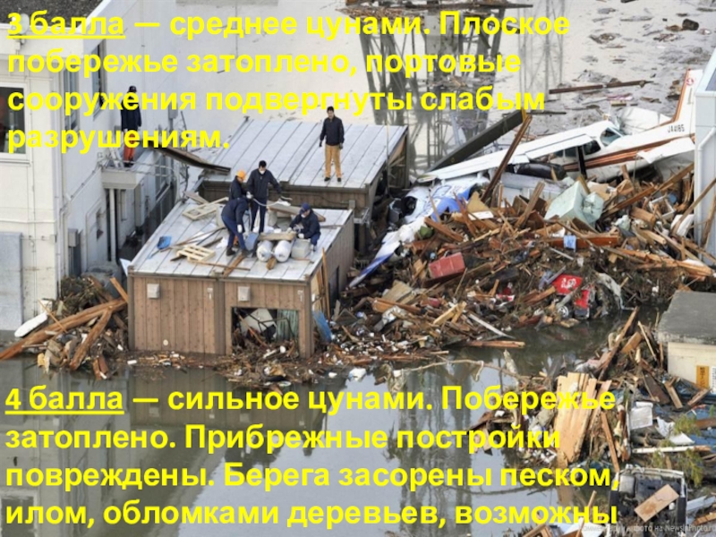 Слайд 174 балла — сильное цунами. Побережье затоплено. Прибрежные постройки повреждены. Берега засорены