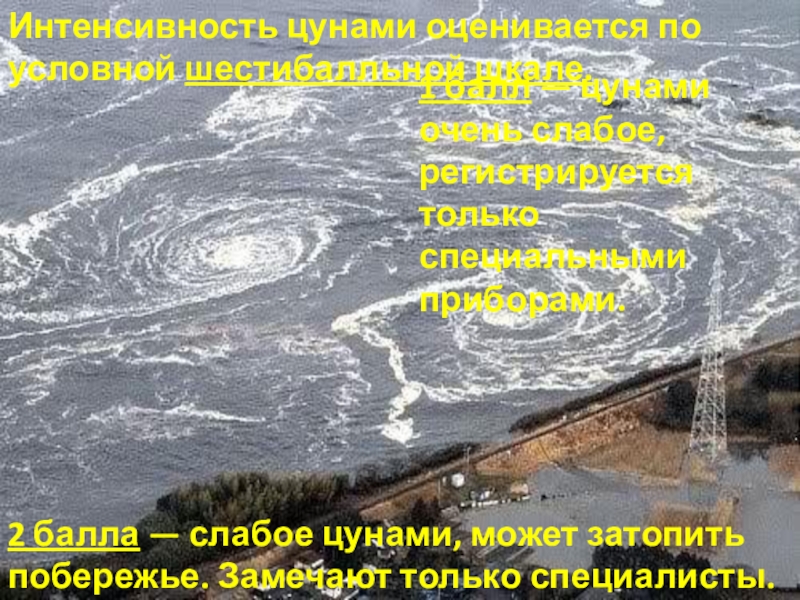 Слайд 16Интенсивность цунами оценивается по условной шестибалльной шкале.