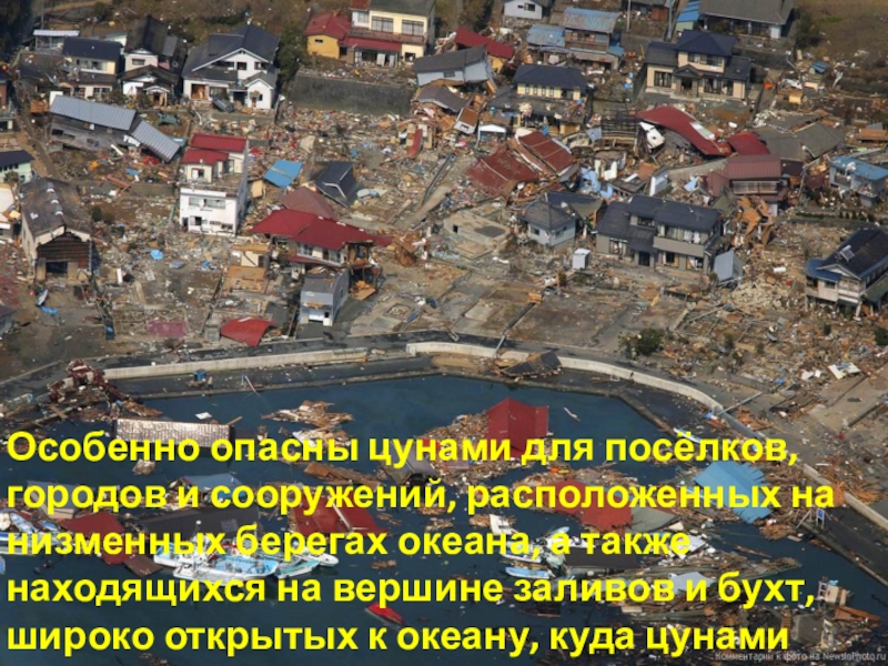Слайд 20Особенно опасны цунами для посёлков, городов и сооружений, расположенных на низменных