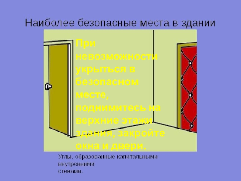 Слайд 28При невозможности укрыться в безопасном месте, поднимитесь на верхние этажи здания,