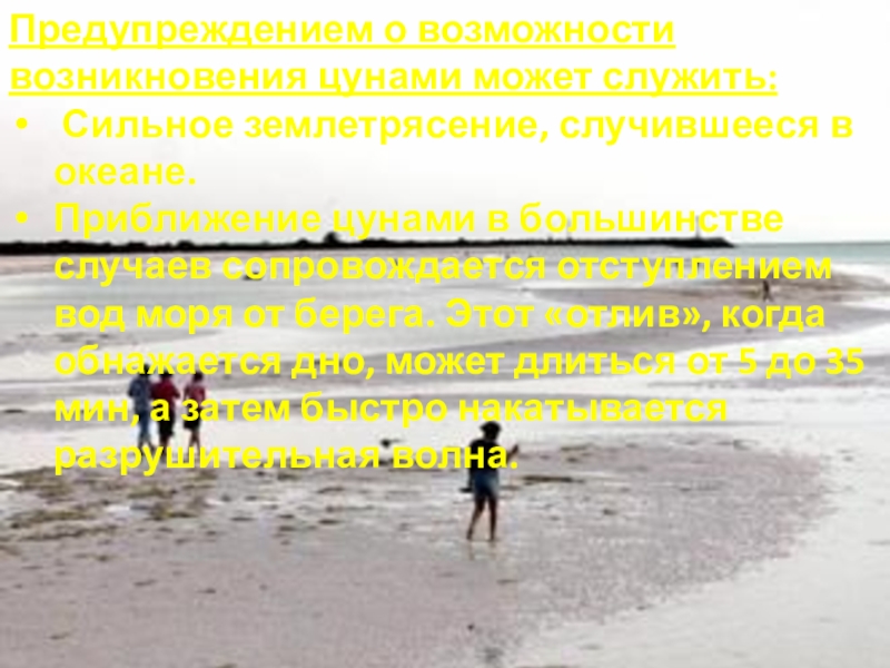 Приближение цунами в большинстве случаев сопровождается отступлением вод моря от берега. Этот «отлив», когда обнажается дно, может длиться от 5 до 35 мин, а затем быстро накатывается разрушительная волна.