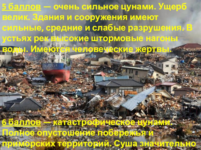 Слайд 185 баллов — очень сильное цунами. Ущерб велик. Здания и сооружения имеют