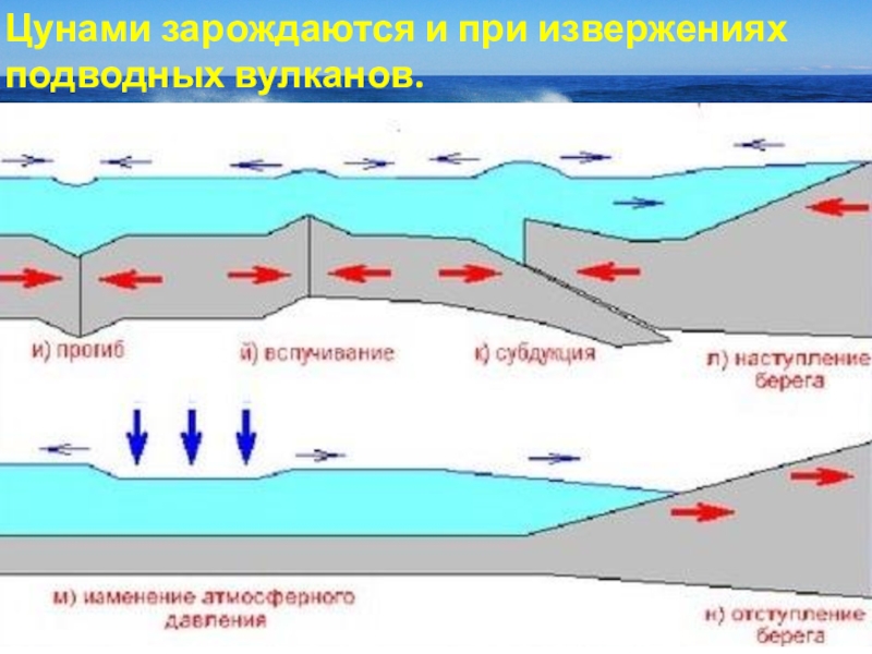 Слайд 7Цунами зарождаются и при извержениях подводных вулканов.