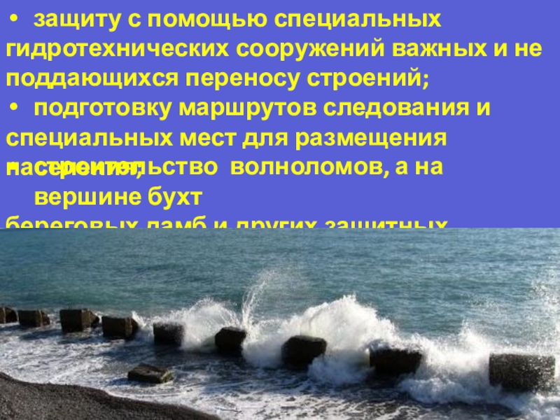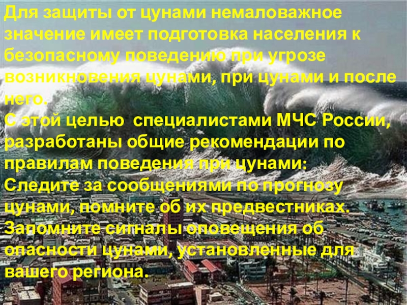 Слайд 24Для защиты от цунами немаловажное значение имеет подготовка населения к безопасному
