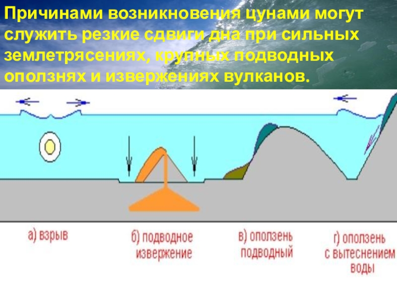 Слайд 5Причинами возникновения цунами могут служить резкие сдвиги дна при сильных землетрясениях,