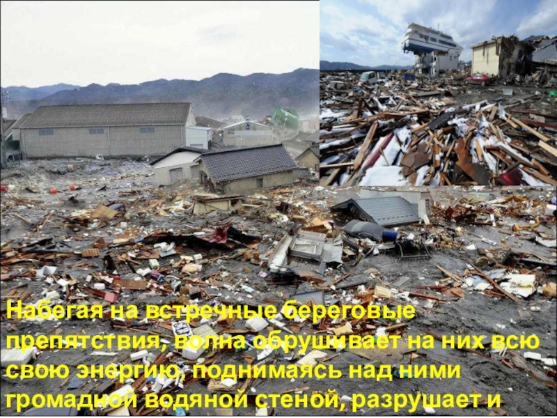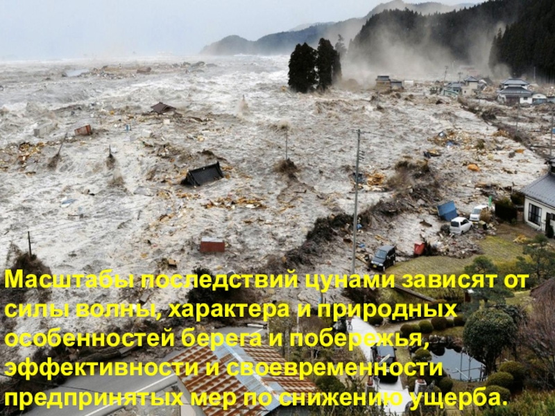 Слайд 19Масштабы последствий цунами зависят от силы волны, характера и природных особенностей