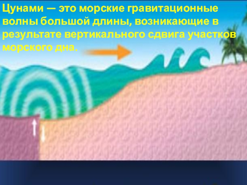 Слайд 4Цунами — это морские гравитационные волны большой длины, возникающие в результате вертикального