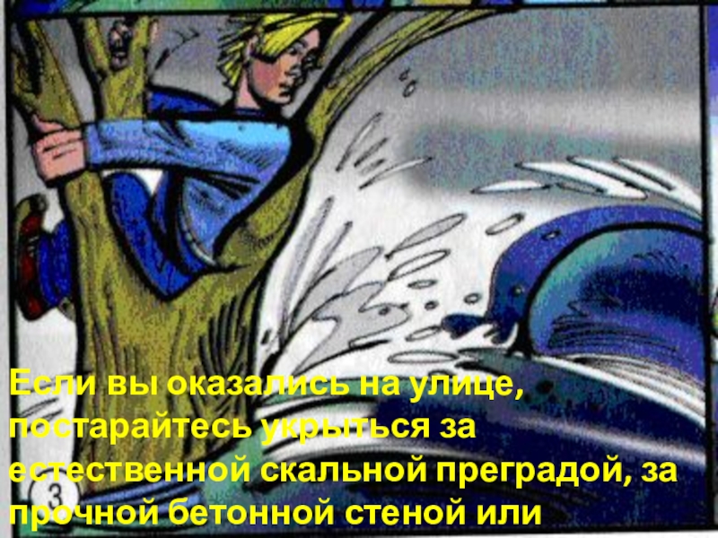 Слайд 29Если вы оказались на улице, постарайтесь укрыться за естественной скальной преградой,