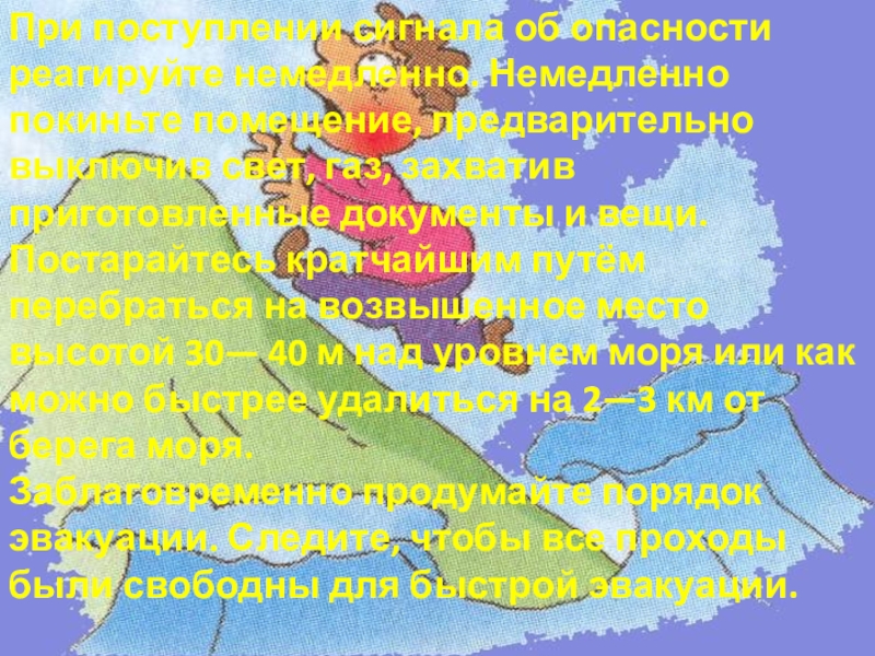 выключив свет, газ, захватив приготовленные документы и вещи. Постарайтесь кратчайшим путём перебраться на возвышенное место высотой 30— 40 м над уровнем моря или как можно быстрее удалиться на 2—3 км от берега моря.
