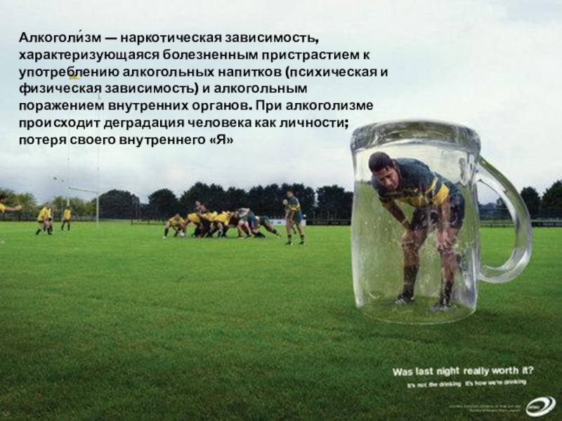 Слайд 6Алкоголи́зм — наркотическая зависимость, характеризующаяся болезненным пристрастием к употреблению алкогольных напитков