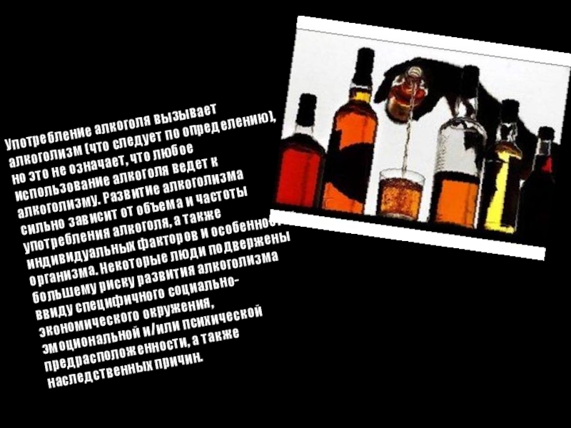 Слайд 8Употребление алкоголя вызывает алкоголизм (что следует по определению), но это не