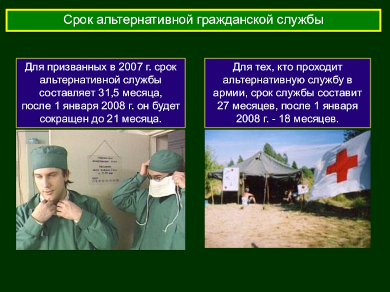 Срок альтернативной гражданской службы Для призванных в 2007 г. срок альтернативной службы составляет 31,5 месяца, после 1