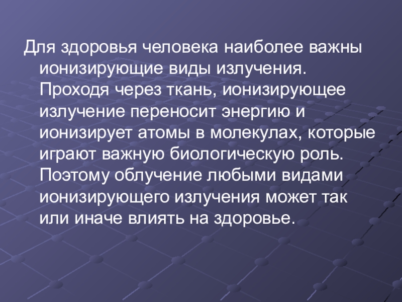 Слайд 12Для здоровья человека наиболее важны ионизирующие виды излучения. Проходя через ткань,