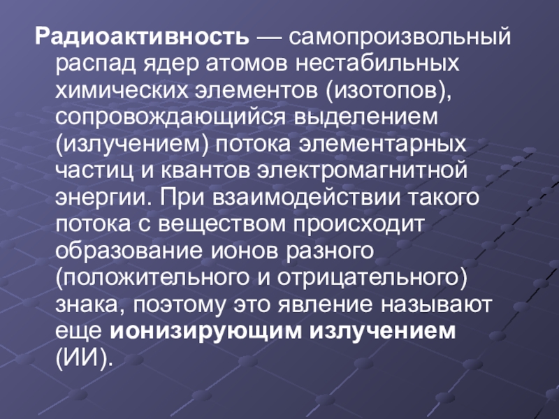 выделением (излучением) потока элементарных частиц и квантов электромагнитной энергии. При взаимодействии такого потока с веществом происходит образование ионов разного (положительного и отрицательного) знака, поэтому это явление называют еще ионизирующим излучением (ИИ).