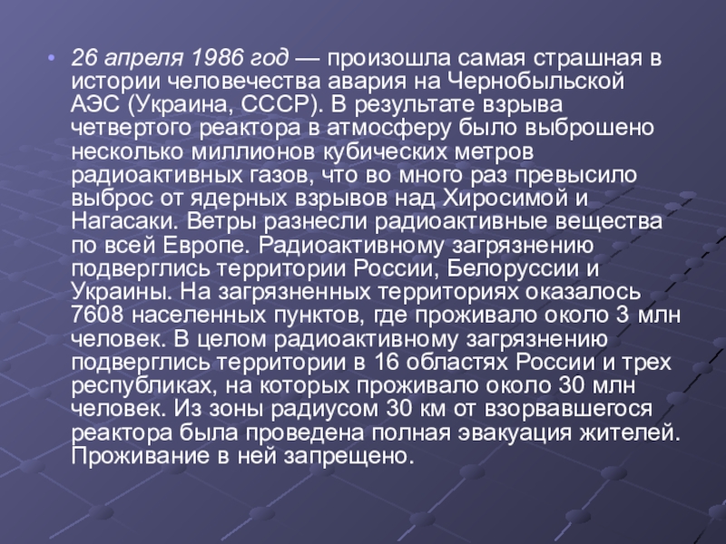 авария на Чернобыльской АЭС (Украина, СССР). В результате взрыва четвертого реактора в атмосферу было выброшено несколько миллионов кубических метров радиоактивных газов, что во много раз превысило выброс от ядерных взрывов над Хиросимой и Нагасаки. Ветры разнесли радиоактивные вещества по всей Европе. Радиоактивному загрязнению подверглись территории России, Белоруссии и Украины. На загрязненных территориях оказалось 7608 населенных пунктов, где проживало около 3 млн человек. В целом радиоактивному загрязнению подверглись территории в 16 областях России и трех республиках, на которых проживало около 30 млн человек. Из зоны радиусом 30 км от взорвавшегося реактора была проведена полная эвакуация жителей. Проживание в ней запрещено.