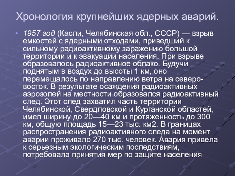 взрыв емкостей с ядерными отходами, приведший к сильному радиоактивному заражению большой территории и к эвакуации населения. При взрыве образовалось радиоактивное облако. Будучи поднятым в воздух до высоты 1 км, оно перемещалось по направлению ветра на северо-восток. В результате осаждения радиоактивных аэрозолей на местности образовался радиоактивный след. Этот след захватил часть территории Челябинской, Свердловской и Курганской областей, имел ширину до 20—40 км и протяженность до 300 км, общую площадь 15—23 тыс. км2. В границах распространения радиоактивного следа на момент аварии проживало 270 тыс. человек. Авария привела к серьезным экологическим последствиям, потребовала принятия мер по защите населения