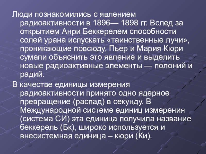 Слайд 4Люди познакомились с явлением радиоактивности в 1896— 1898 гг. Вслед за