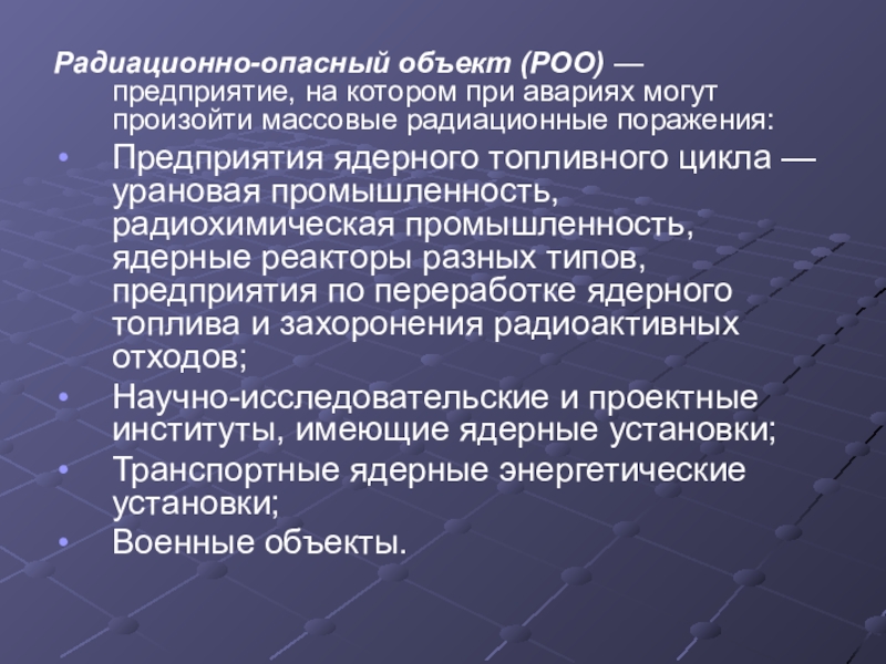 Слайд 11Радиационно-опасный объект (РОО) — предприятие, на котором при авариях могут произойти