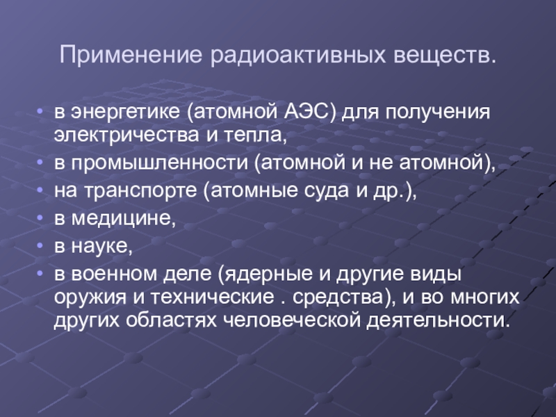 широкое внедрение радиоактивных элементов в различные области науки, техники, медицины.