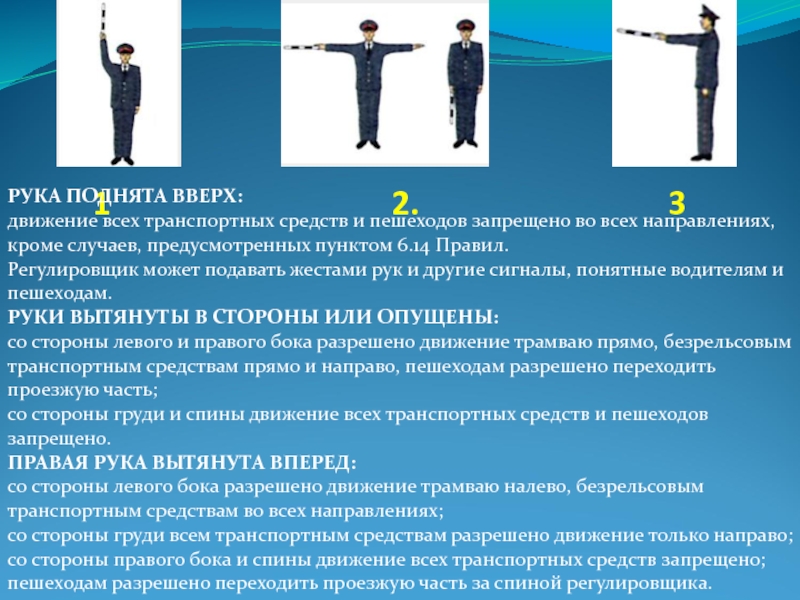 Регулировщик может подавать жестами рук и другие сигналы, понятные водителям и пешеходам.