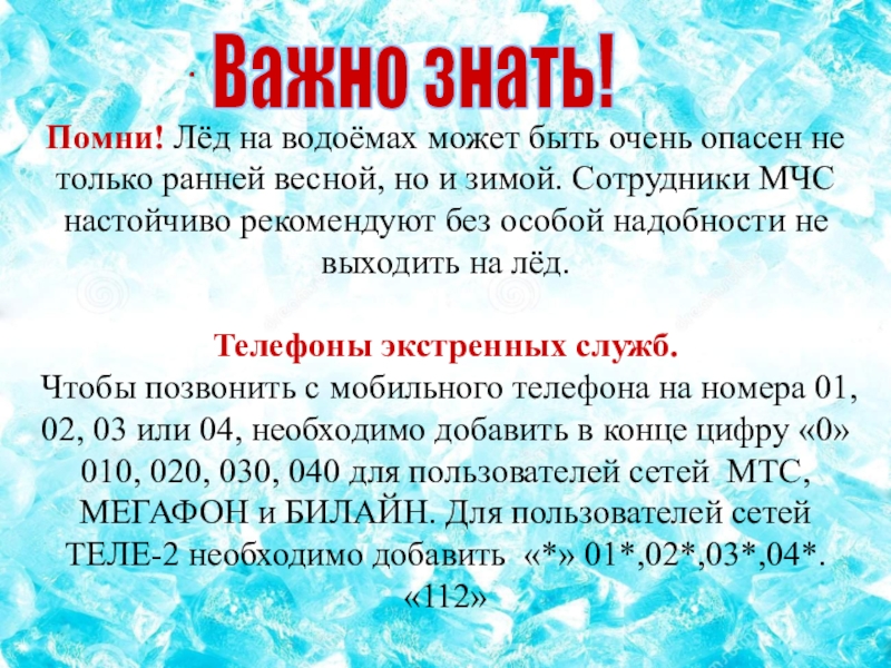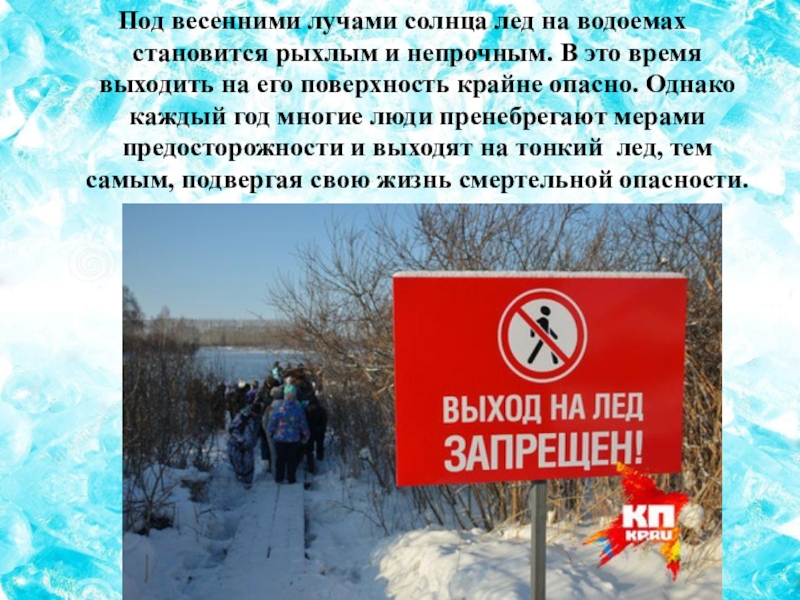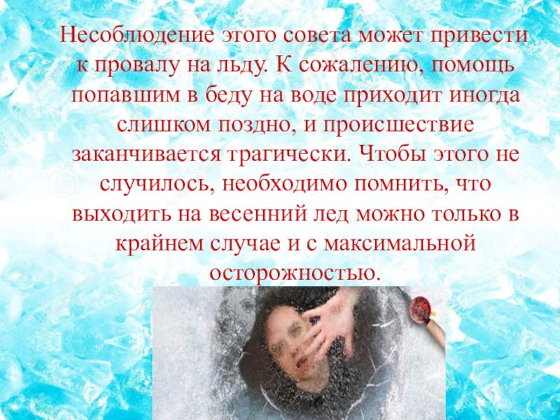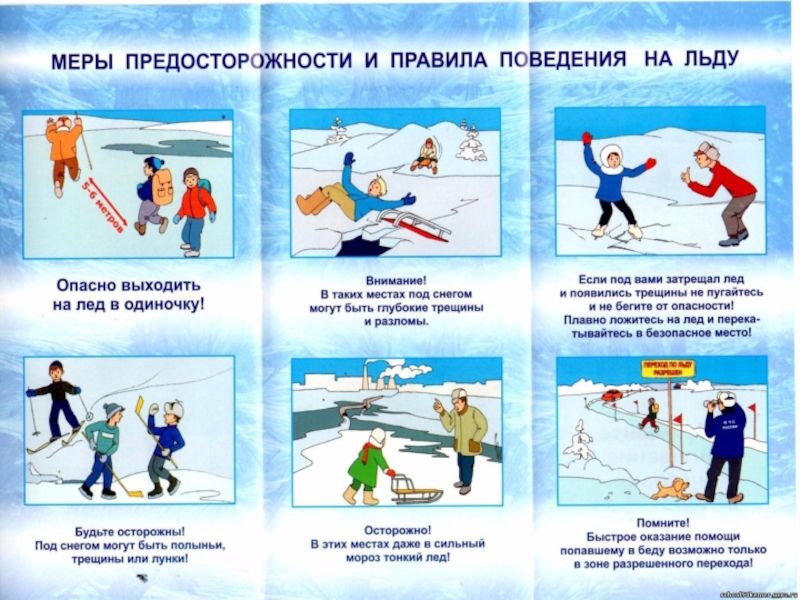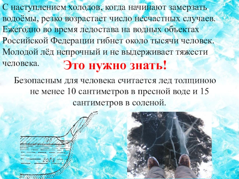 С наступлением холодов, когда начинают замерзать водоёмы, резко возрастает число несчастных случаев. Ежегодно во время ледостава на водных объектах Российской Федерации гибнет около тысячи человек. Молодой лёд непрочный и не выдерживает тяжести человека.