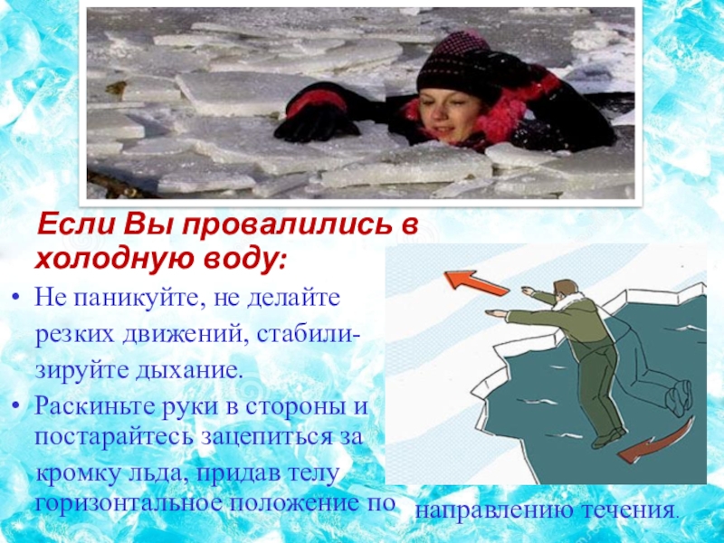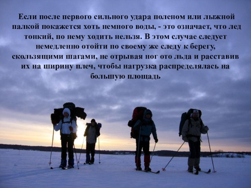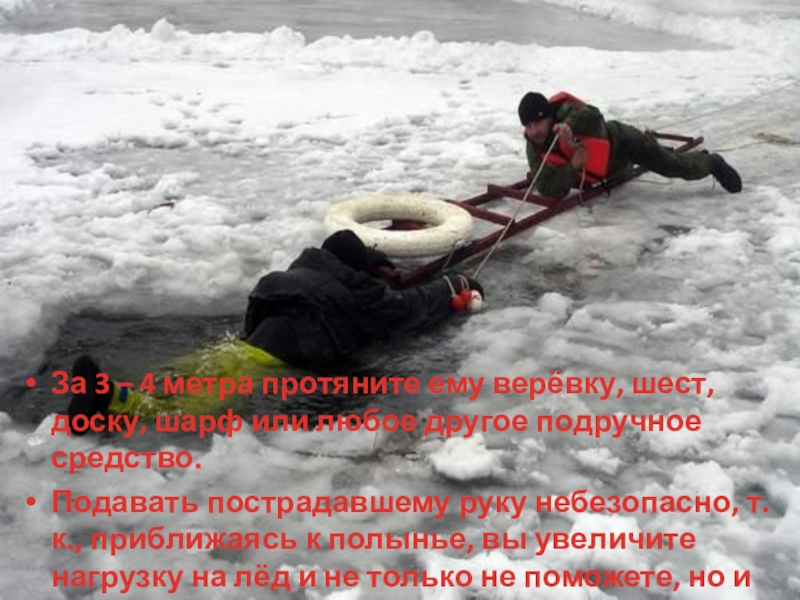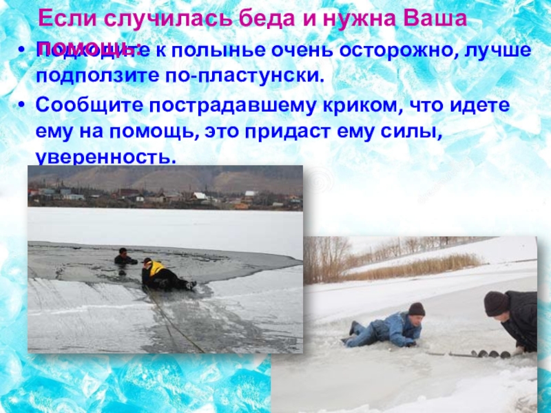 Приближаться к полынье можно только ползком, широко раскинув руки. Будет лучше, если вы сможете подложить (под себя лыжи, доску, фанеру - увеличить площадь опоры - и ползти на них.