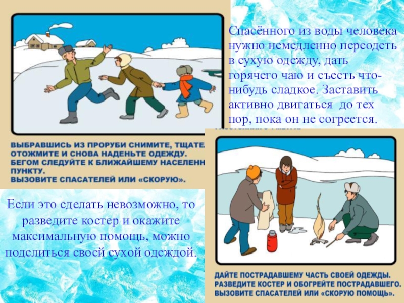 Если это сделать невозможно, то разведите костер и окажите максимальную помощь, можно поделиться своей сухой одеждой.