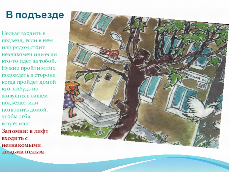 незнакомец или если кто-то идет за тобой. Нужно пройти мимо, подождать в стороне, когда пройдет домой кто-нибудь из живущих в вашем подъезде, или позвонить домой, чтобы тебя встретили.