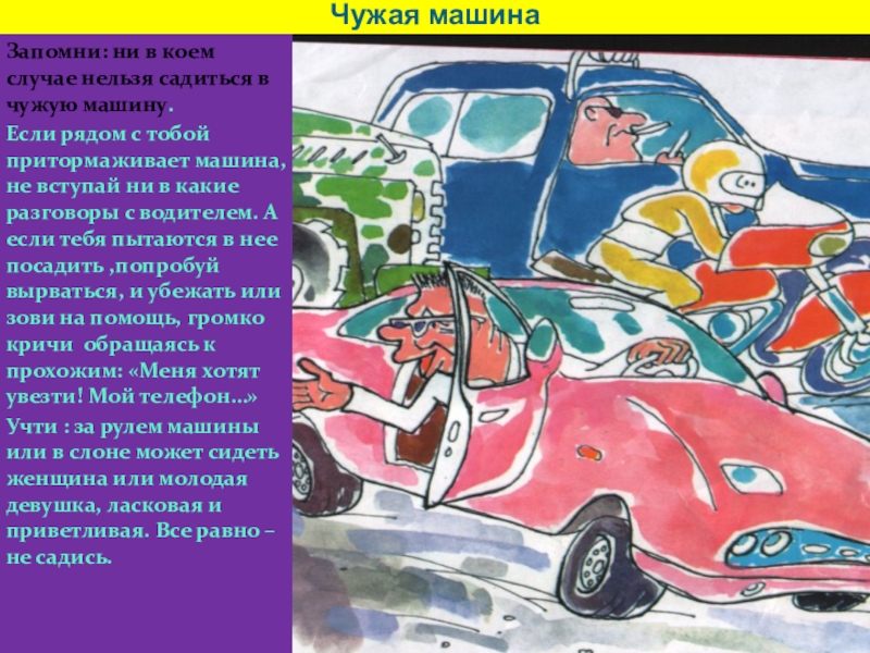 Чужая машинаЗапомни: ни в коем случае нельзя садиться в чужую машину. Если рядом с тобой притормаживает машина,