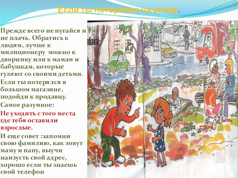 Если ты потерялся на улице.Прежде всего не пугайся и не плачь. Обратись к людям, лучше к милиционеру