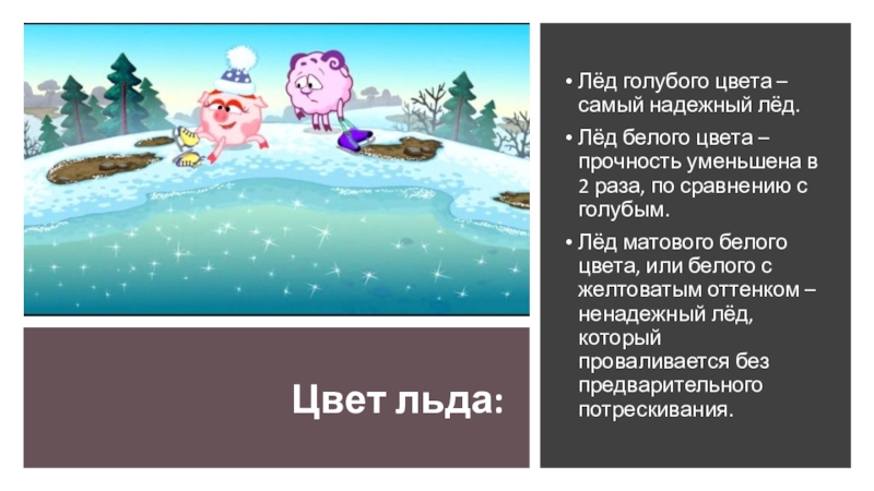 Цвет льда:Лёд голубого цвета – самый надежный лёд.Лёд белого цвета – прочность уменьшена в 2 раза, по
