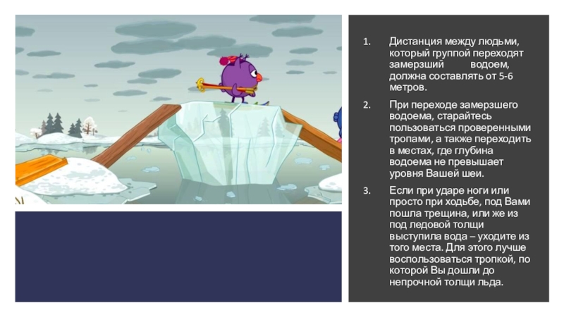Дистанция между людьми, который группой переходят замерзший      водоем, должна составлять от 5-6