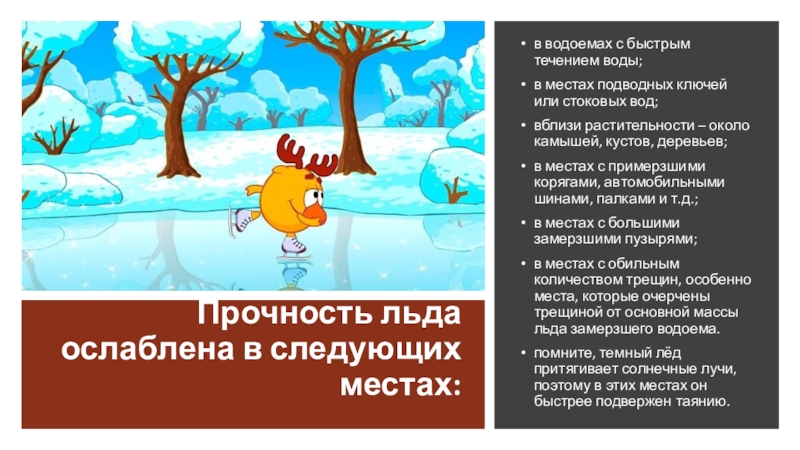 Прочность льда ослаблена в следующих местах: в водоемах с быстрым течением воды;в местах подводных ключей или стоковых
