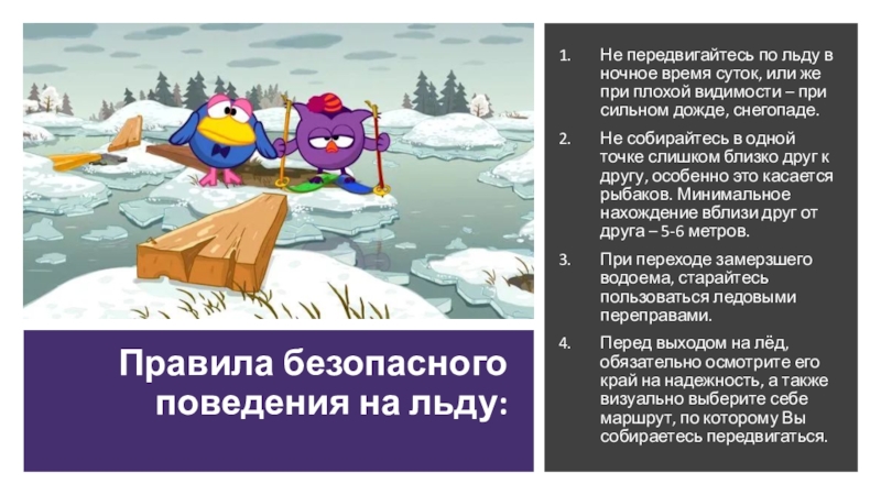 Правила безопасного поведения на льду: Не передвигайтесь по льду в ночное время суток, или же при плохой